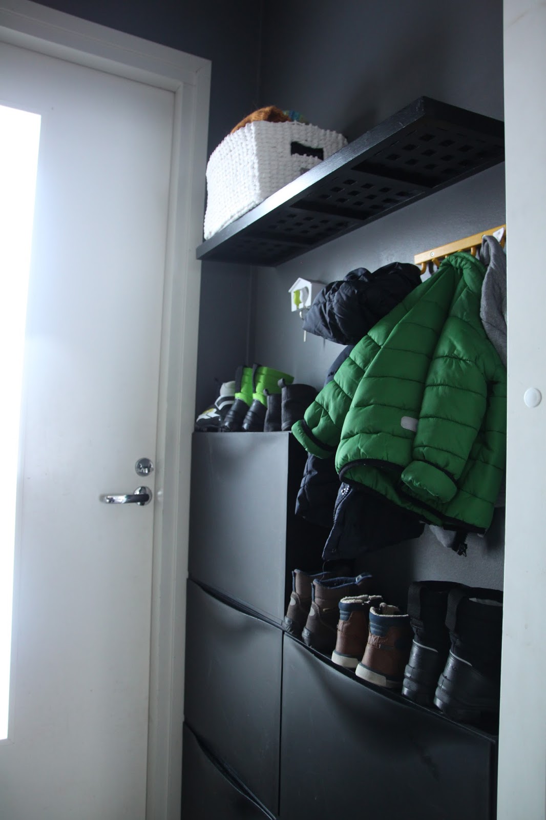 Tuulikaapin muoviset kenkätelineet on ikeaa ja jätin ne tarkoituksella eri tasolle, jotta yläpuolelle jää naulakkotilaa pienille takeille. Lasten kengät mahtuu näppärästi laatikoiden päälle. Seinähyllyt ja säilytyslaatikko ovat myös Ikeasta. Mustavalkoiset korit on Clas Ohlsonilta.