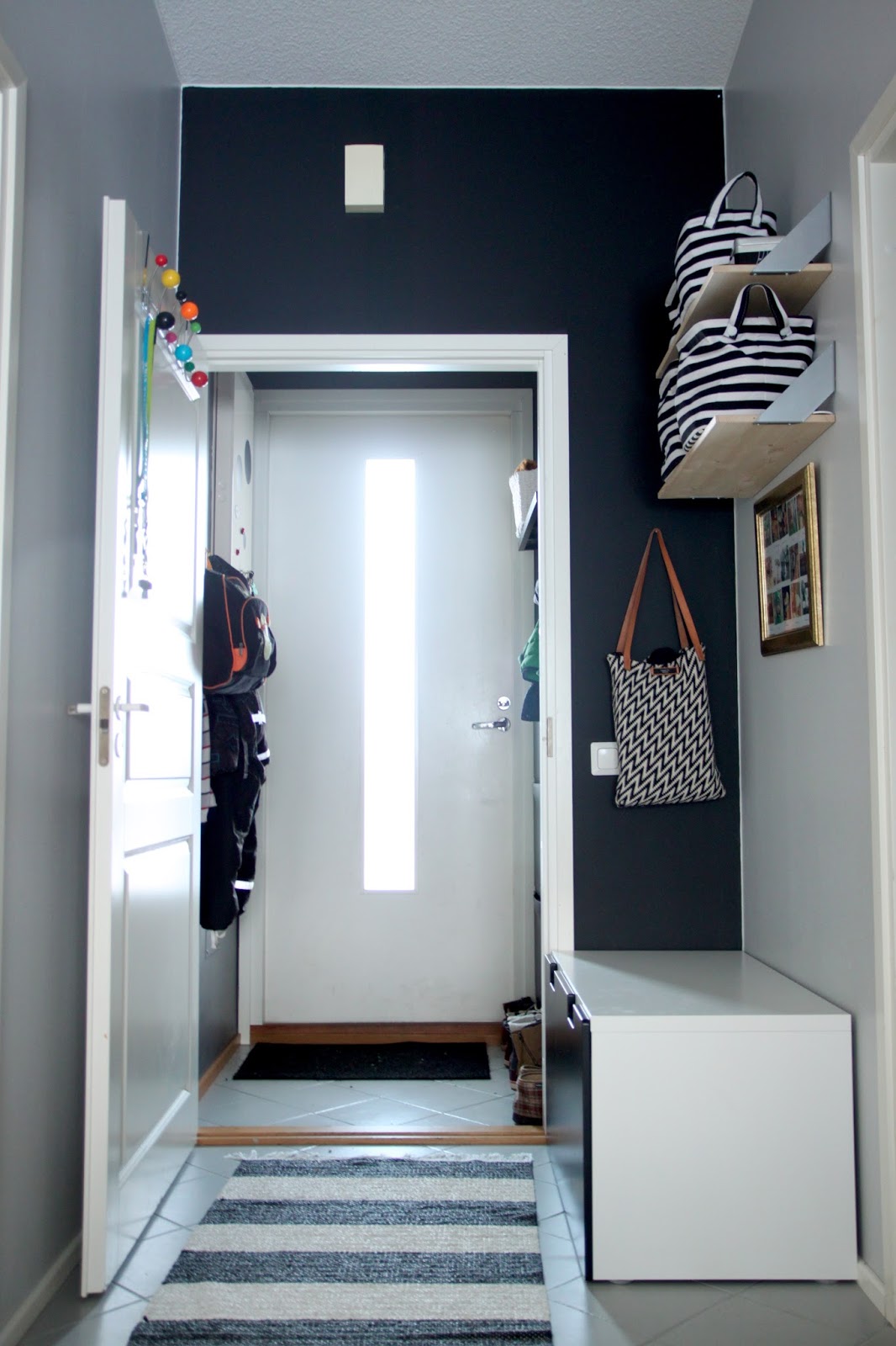 Eteistä inhoan kodissamme ylivoimaisesti eniten ja syy on yksinkertainen - siellä vallitsee loppumaton kaaos. Yleensä kulkutilaa ei ole näinkään runsaasti, sillä kapean käytävän täyttää naulakoissa roikkuvat takit ja haalarit. Sisääntulon valloittaa myös lapsen rattaat, joten ulos meno on melkoista askartelua. Miehen mielestä säilytyspenkki on tarpeellinen, kun vauva täytyy pukea sylissä. Minun mieleen olisi ennemmin liukuovikaappi, joka kätkisi sisäänsä kaikki lasten ulkovaatteet. Molempi parempi. Ainakin melkein.