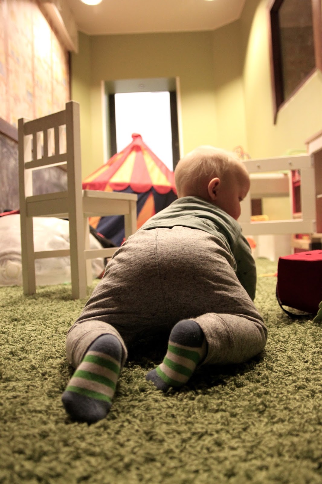 Ehtassa leikkipaikka oli ratkaistu täydellisesti ja ravintolasta löytyikin lapsille todennäköisesti kaupungin kivoin ravintolan leikkihuone. Lattialle oli kauttaaltaan kiinnitetty karvalankamatto, joten 10kk ryömi siellä mielellään. 1,5 tunnin ruokailu sujui upeasti, kun vauvankin pystyi välillä laskemaan lattialle toihuilemaan sen sijaan, että joutuisi tylsistymään syöttötuolissa.