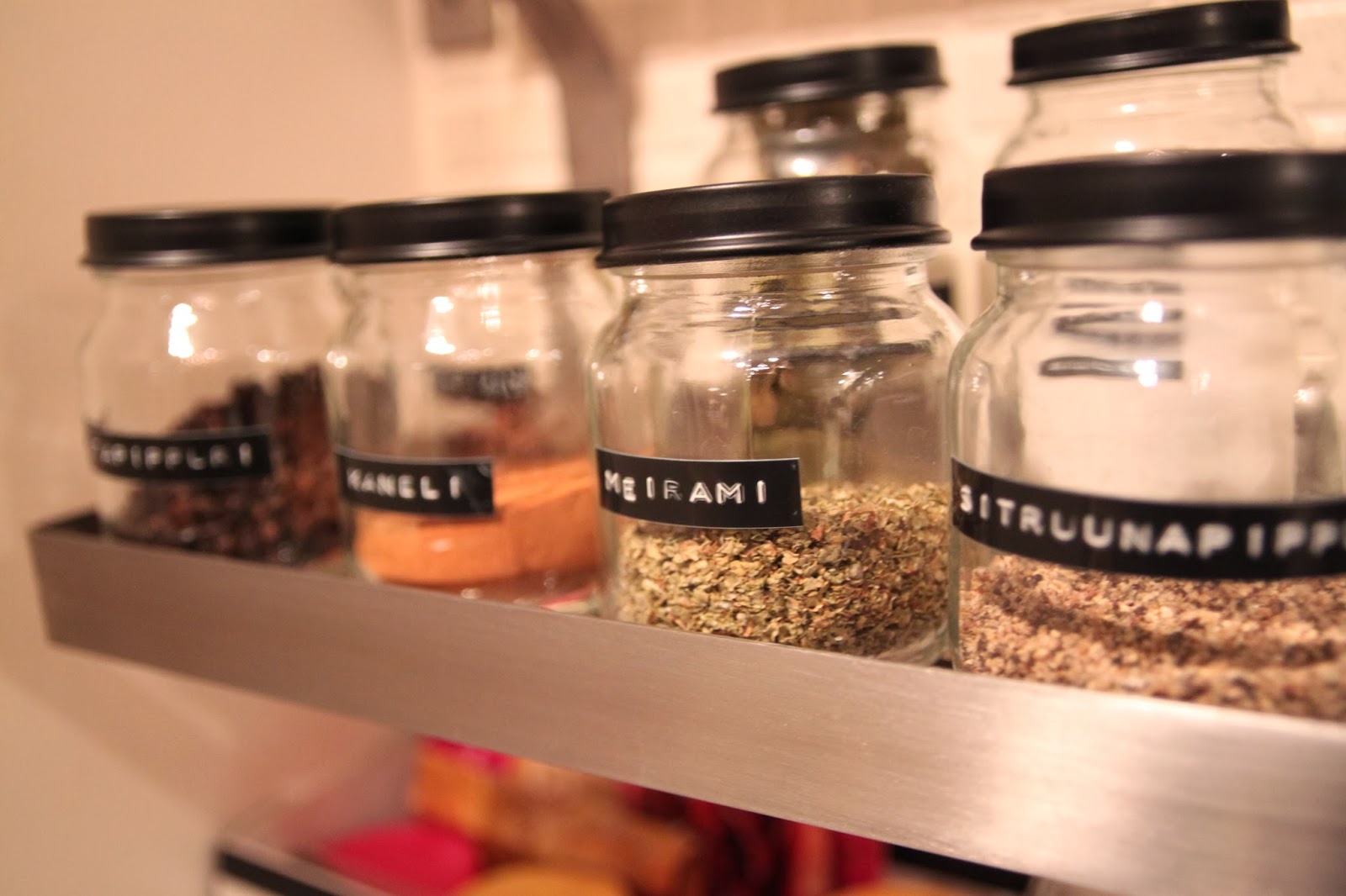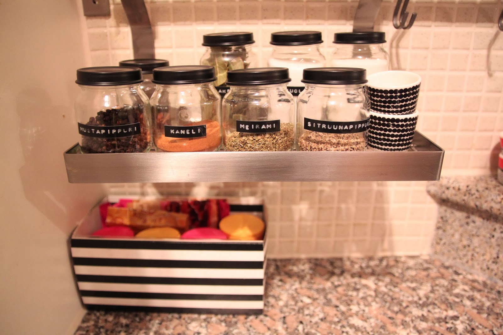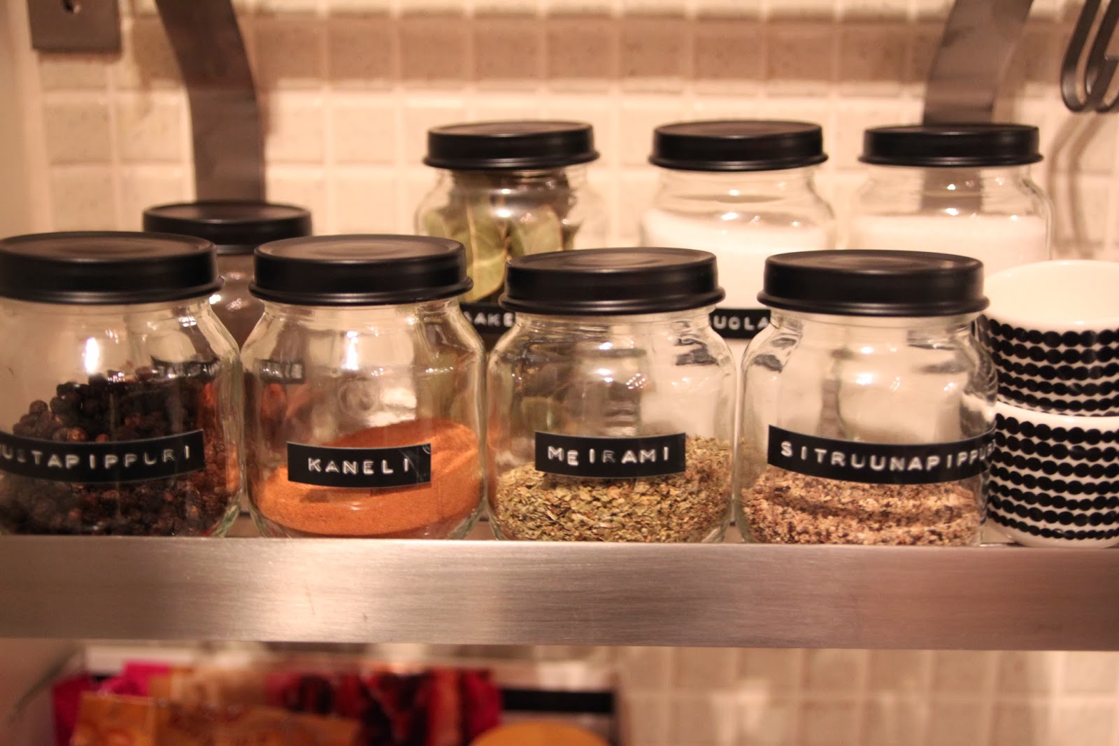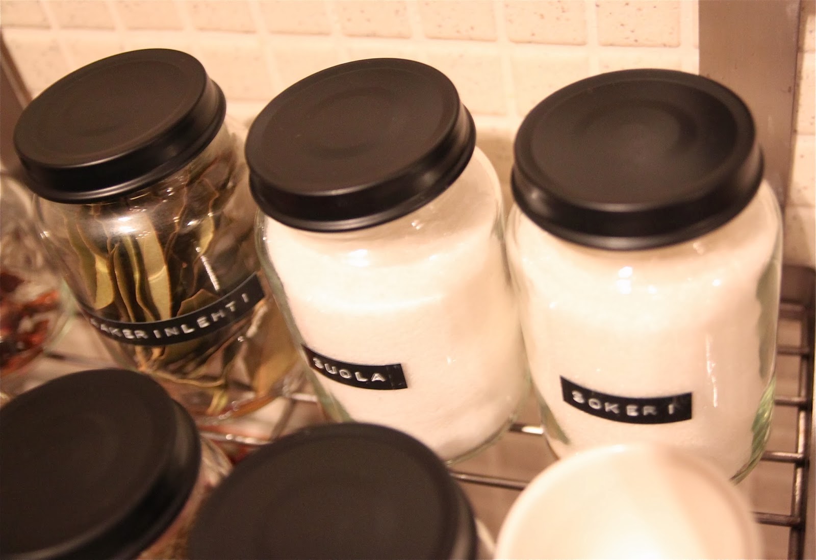Tänään kävin ostamassa dymon. Aivan ihana vehje ja epäilen, että kohta meidän koti on kuorrutettu dymo-teksteillä. :) Pilttipurkkien kannet maalasin mustalla spraylla ja dymolla kirjoitin purkkien kylkeen mitä kukin purnukka sisältää. Idean nappasin täältä Niittykulmasta. :)