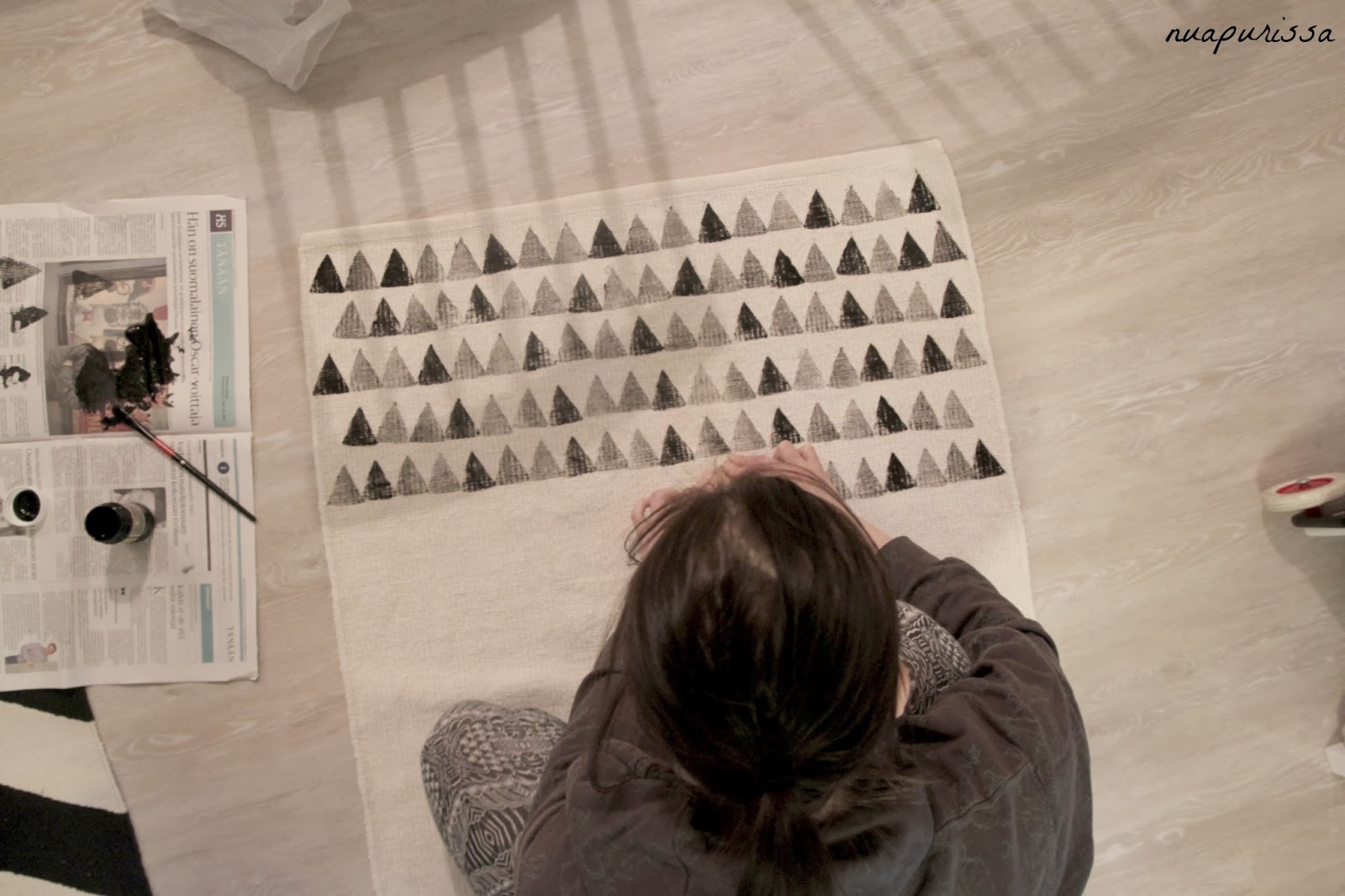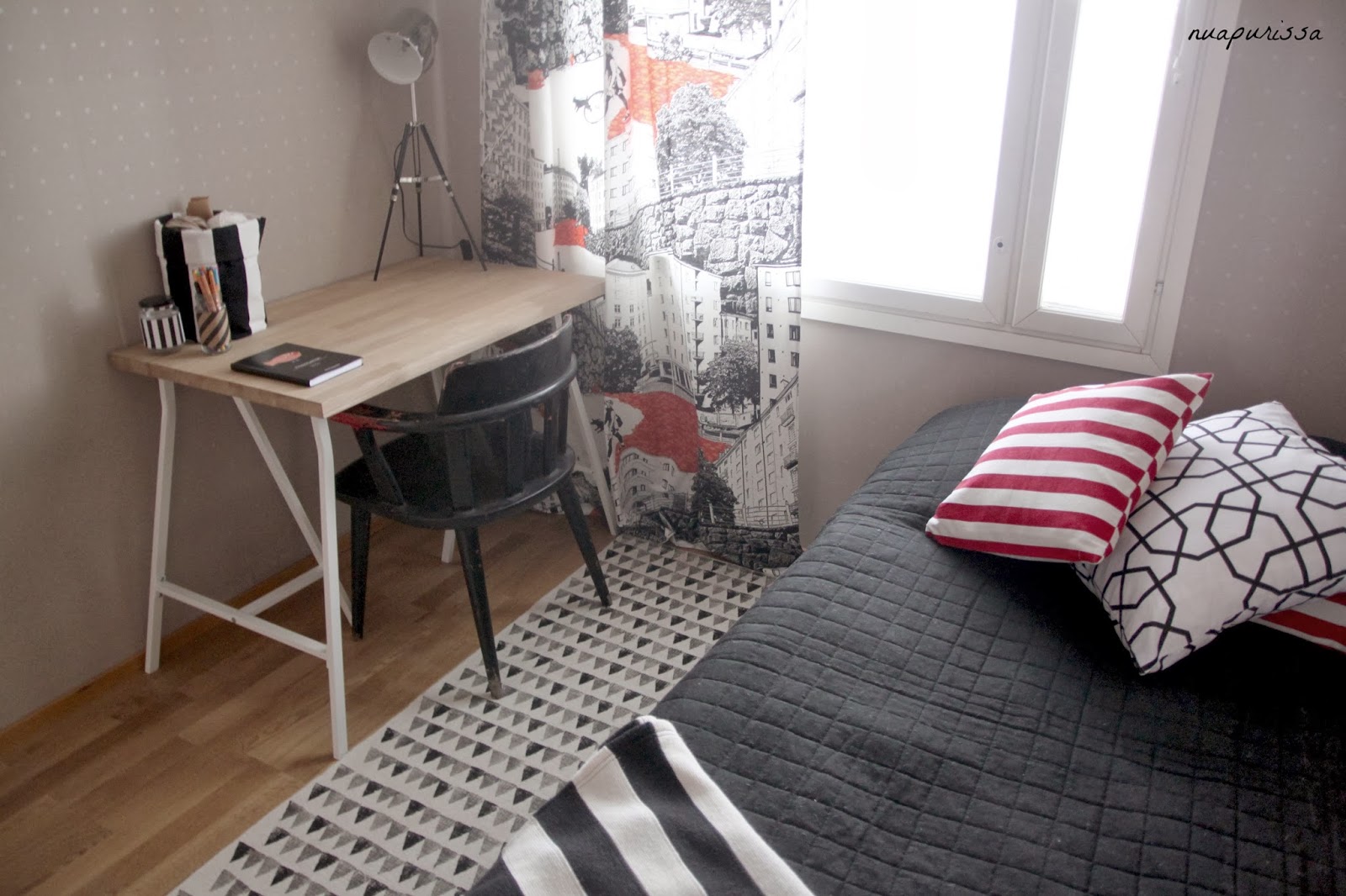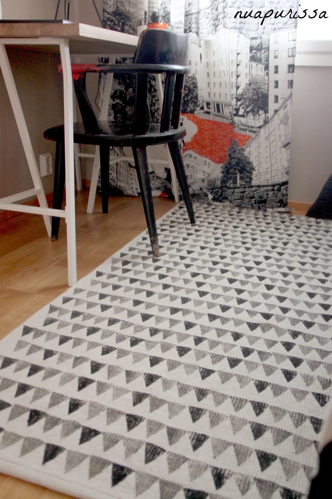 Ostin ystävältä valkoisen maton, jota en ole vieläkään maksanut. Hei, Maryt! Jos ja kun sulla loppuu reissussa rahat, niin laitappa tilinumeroa ja summa tulemaan. Matto oli vähän tylsä ja muutenkin vieras-/työhuone kaipasi pikaista ehostusta ennen varsinaista pintaremonttia, joka on tarkoitus toteuttaa lähitulevaisuudessa.