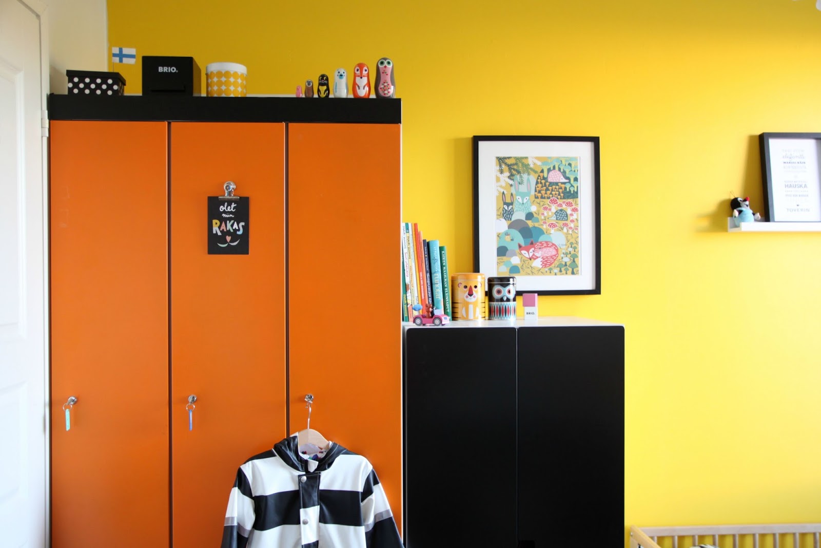 Irroitin seinästä, sängyn päältä, tauluhyllyn ja kiinnitin tilalle Ferm Livingin ihanan seinävalaisimen, jonka kuopus sai lahjaksi kummitädiltään. Toimii hyvin yövalona. Lasten kirjat on tosi näppärä säilyttää tuossa Granitin metallikorissa (mustan kaapin päällä) ja korin voi sitten tarvittaessa nostaa lapsosten ulottuville. Näitä ohutsivuisia kun ei voi vielä pienimmän kätösiin antaa.