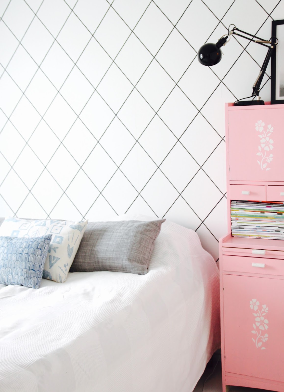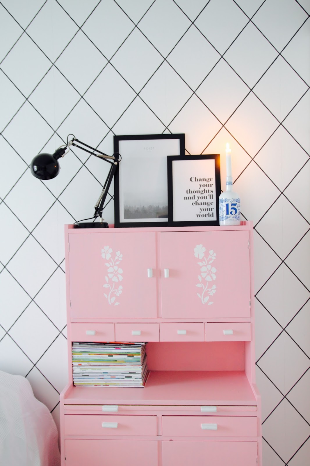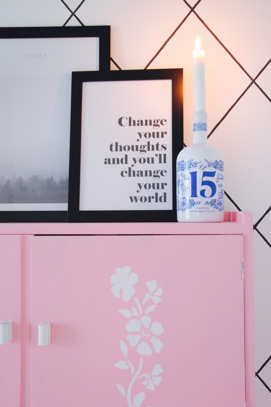 Laitoin ensin postauksen otsikoksi match made in heaven. Niin kivasti meinaa käy tuo uusi päiväpeitto (ikea) meidän makkariin ja Blossan glögipullo vaaleanpunaisen kaunottaren kaveriksi. Mies yllätti, kun tuli kauppareissulta kotiin ja kertoi valinneensa pullon sisustukseen sopivaksi. Aika kivasti ajateltu. Pakkohan se oli heti juoda, että sain pullon hyllylle koreilemaan