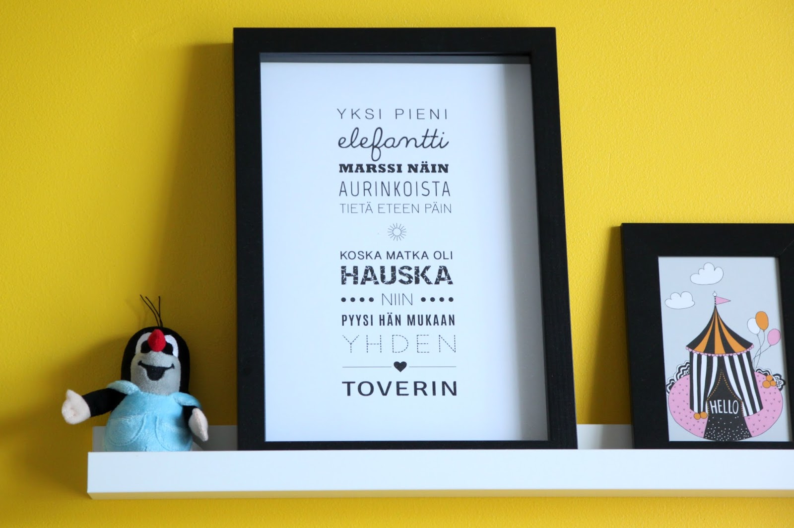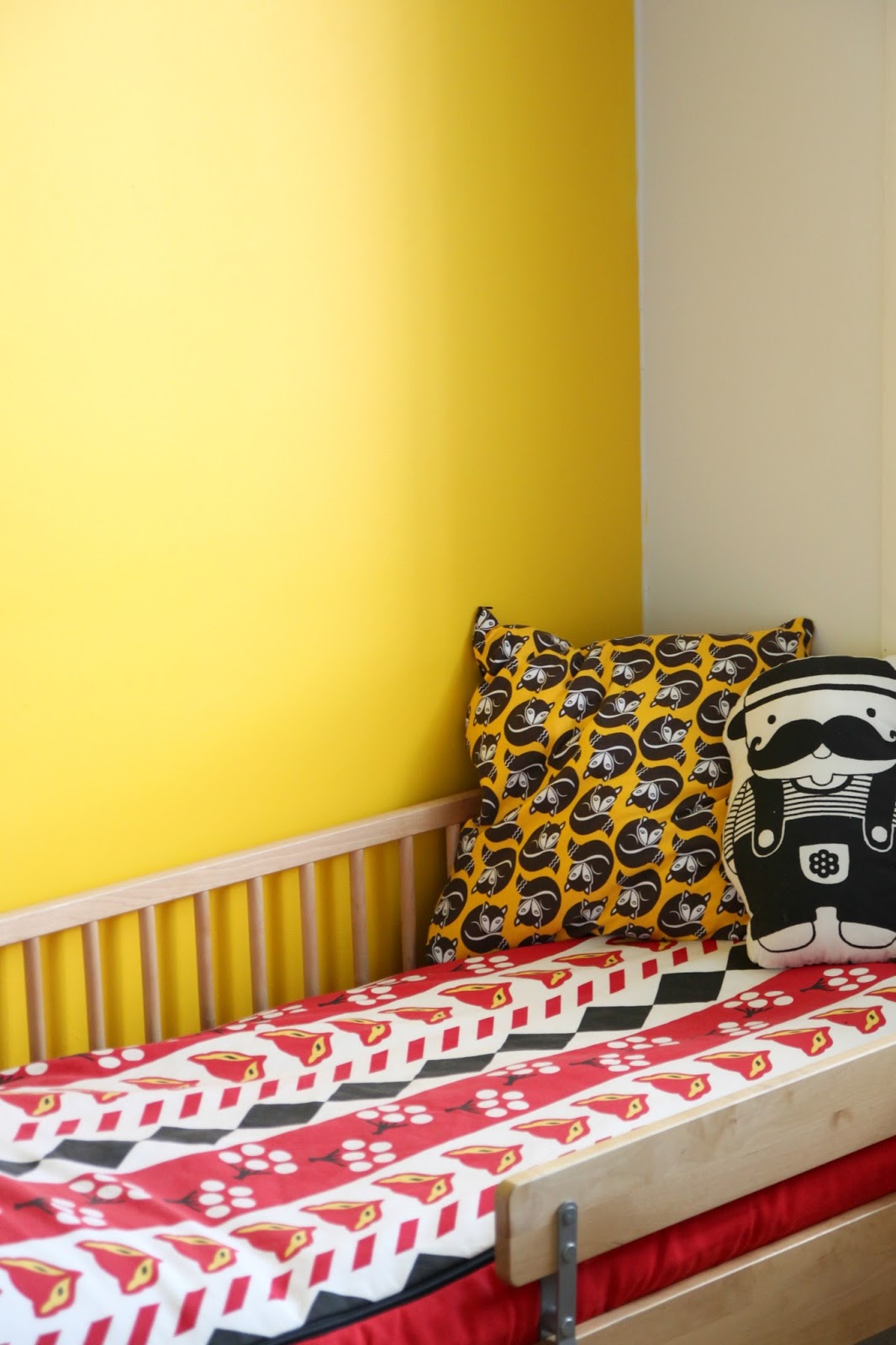 Pojat muutti samaan huoneeseen ja minä sain vauvan huoneesta työ-/askarteluhuoneen, jonne voi huoletta jättää keskeneräiset työt levälleen. Makuuhuoneet eivät ole meillä järin suuria, joten järjestysvaihtoehtoja ei ollut montaa. Pinnasänky kuitenkin mahtui mukavasti heti oven viereen ja isomman pojan sänky pääsi keltaista seinää vasten. Kuvissa ei näy marimekon keltamustaa räsymattoa, joka keikkuu ikkunan toisella laidalla. Muutama taulu ja yövalo on vielä asentamatta paikoilleen, mutta jäipähän jotain kuvattavaa myös ensi kertaan.